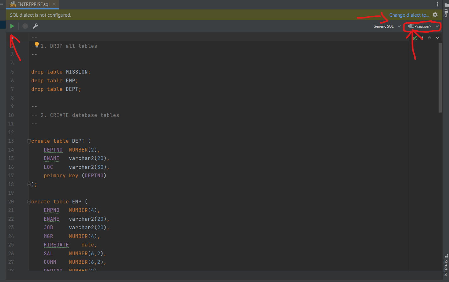- Avec le bouton "Change dialect to" vous pouvez régler l'éditeur pour lui dire de valider la syntaxe d'Oracle